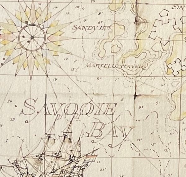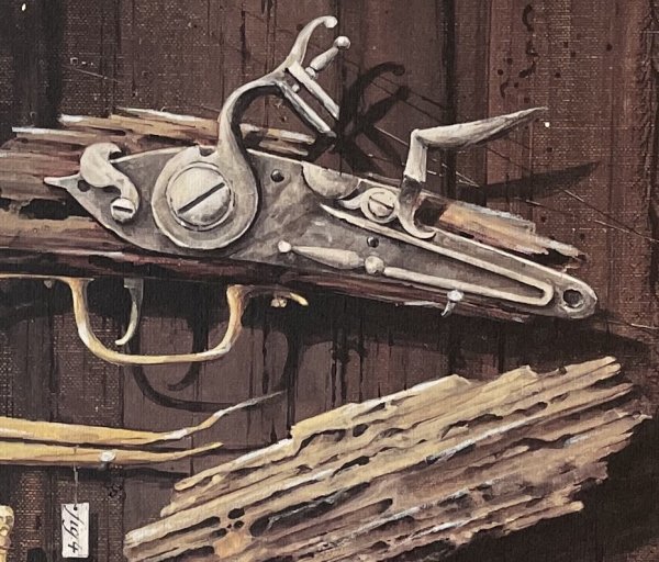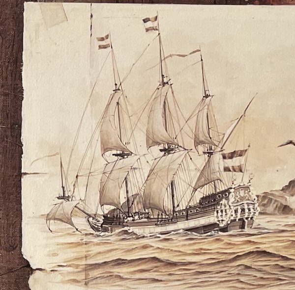Der in bräunlichen Farben gehaltene Druck stellt den Untergang eines Schiffes dar. Zeichnungen der Havarie und womöglich danach vom Meeresboden aufgelesene oder an die Strände gespülte Gegenstände des Seglers unterstreichen die malerische Erzählung eines realen Ereignisses.