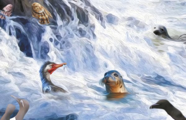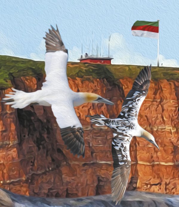 In „Helgoland, Seebad der Tiere“ zeigt Gero Paul die Insel aus einer ungewöhnlichen Perspektive: Tiere übernehmen das Kommando. Seehunde genießen das Strandleben, Möwen und Trottellummen tummeln sich am Wasser, ein Schaf liegt genüsslich im Strandkorb – alles vor der markanten Kulisse des roten Felsens. Dieses charmante Bild bringt norddeutschen Humor, Naturbeobachtung und Fantasie auf den Punkt – ein Kunstwerk zum Schmunzeln und Staunen.
